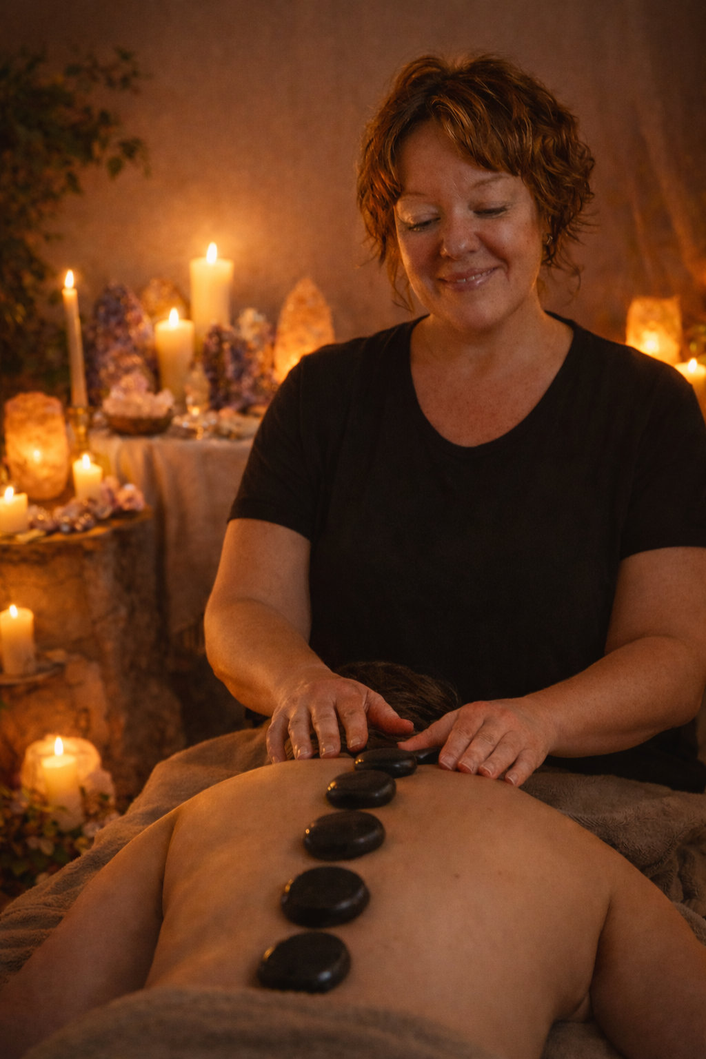 Med en kombination av healing och massage* med varma lavastenar får du lugna ditt nervsystem, landa i kroppen och ladda din kraft.